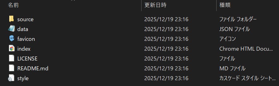 ダウンロードしたzipフォルダを解凍すると、各種ファイルが並んでいます。「data」と書かれたjsonファイルを任意のアプリケーションで開き(ここではメモ帳を使用)、内部のテキストデータを編集していきます。