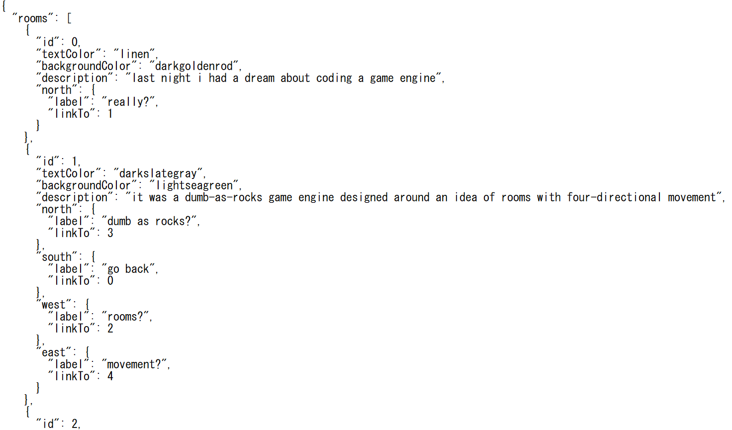 テキストゲーム向けのツールという点ではincrepareことStephen Lavelle氏による「tinychoice」に近い雰囲気もありますが、選択肢が方向と紐づいていること、カラーバリエーションによる視覚的な応用性、一部屋に置ける出口の数が最大4つまでと限定されているなどミニマルながら細かい遊びが利く部分も多そうです。